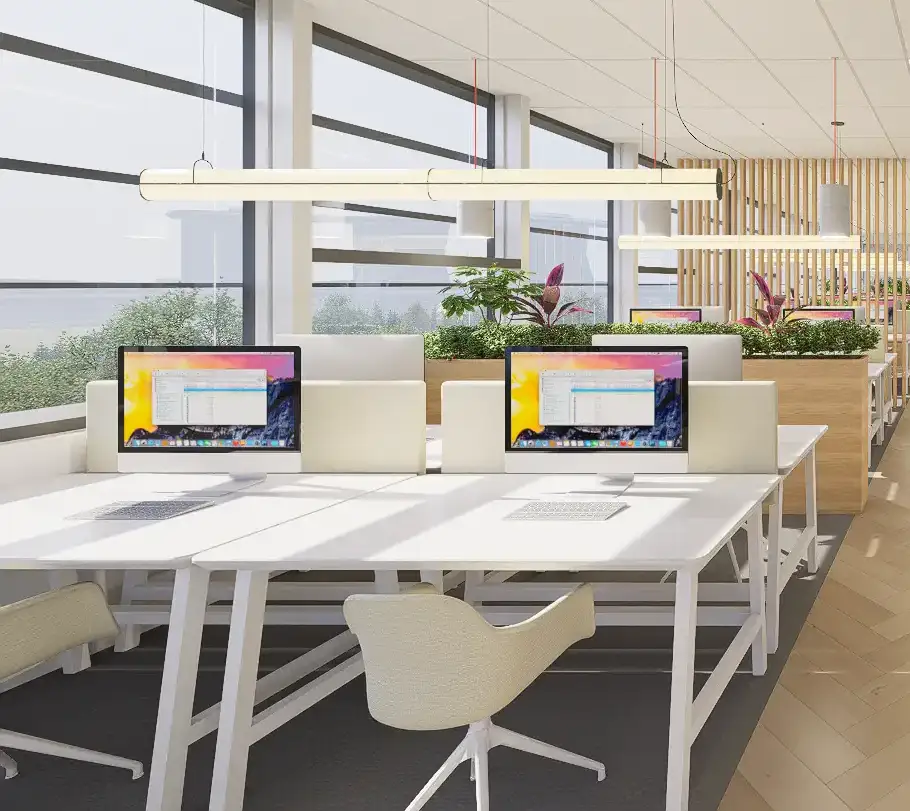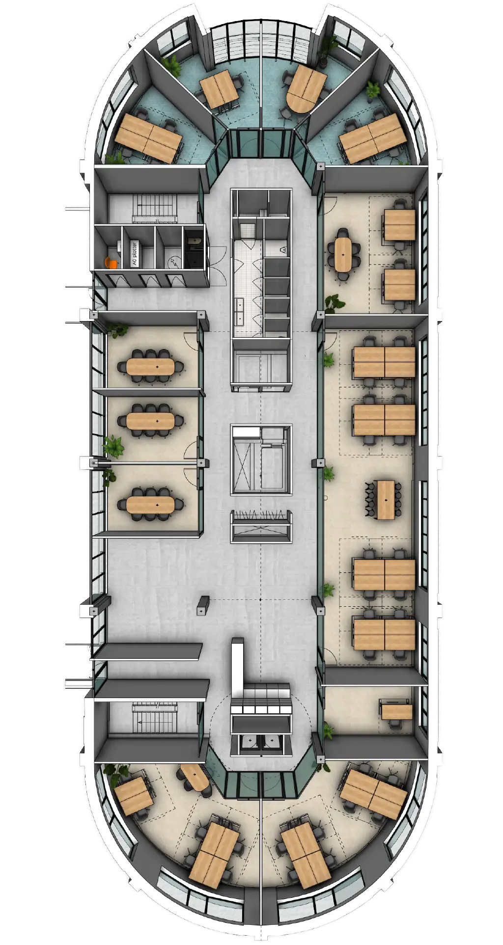 We ontwerpen werkplekken, vergaderruimtes, ontmoetingszones en opslagruimte logisch in samenhang met zichtlijnen, looproutes en daglicht. We houden rekening met arbo-eisen, installaties en de bouwkundige structuur van het pand.