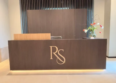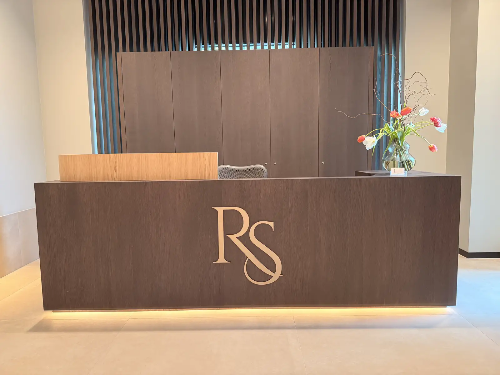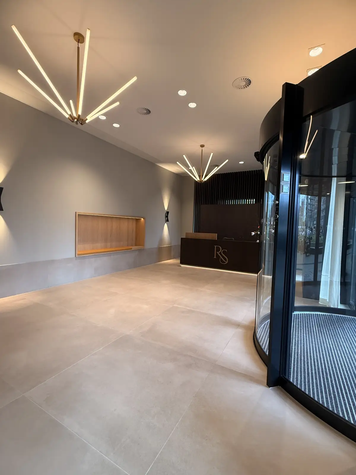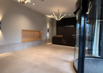 De lobby heeft een rustige en uitnodigende uitstraling gekregen. Grote natuurstenen vloertegels, een maatwerk receptiebalie in donker hout met het RS-monogram en indirecte verlichting. Stervormige messing hanglampen geven de ruimte karakter. Een ingebouwde houten nis met oranje zitkussen maakt de entree etra uitnodigend. In alle lifthallen – van de kelder tot de 24e etage – zijn de wanden en liftomlijstingen met een bronsgekleurde RVS-wrap afgewerkt. Een detail dat de lijn van de lobby doorzet tot op de hoogste verdieping.