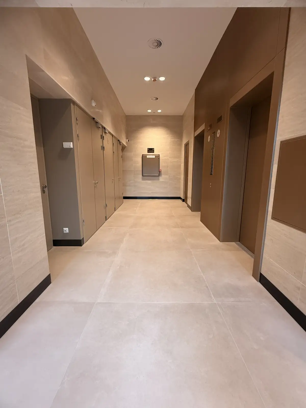 Résidence Symphony is een markante woontoren aan het Gustav Mahlerplein in Amsterdam, midden op de Zuidas. De Vereniging van Eigenaren vroeg About Projects om de lobby en alle lifthallen – van de 2e tot en met de 24e etage – te renoveren naar een ontwerp van Maison Libre. We voerden het project in drie fases uit en leverden het op in april 2026.